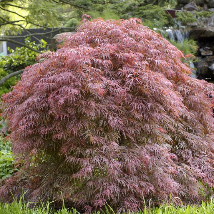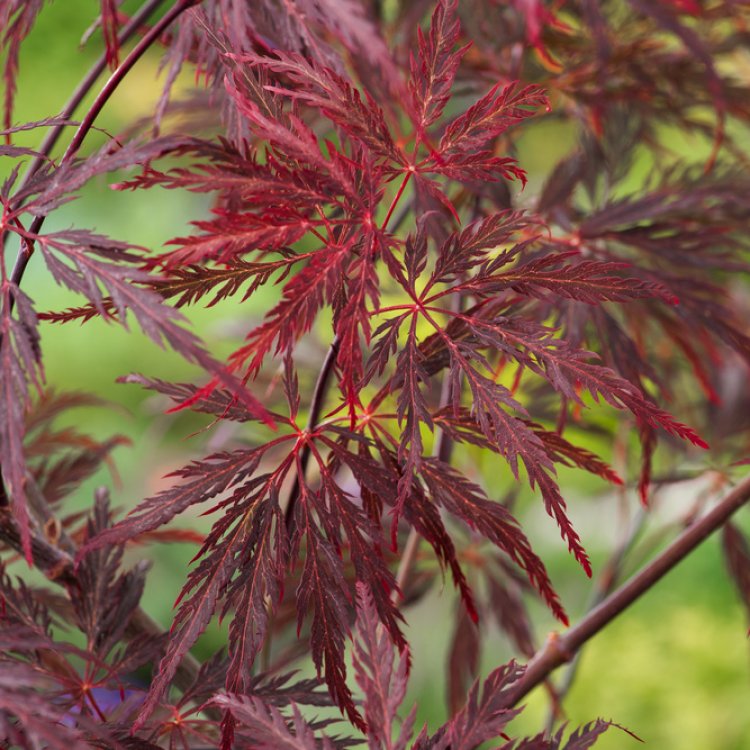 The true charm of Acer palmatum ‘Garnet’ lies in its leaves. They emerge bright, luminous crimson in spring, deepening to rich, dark purple-red through summer. Each leaf is deeply dissected, creating a delicate, lace-like texture.