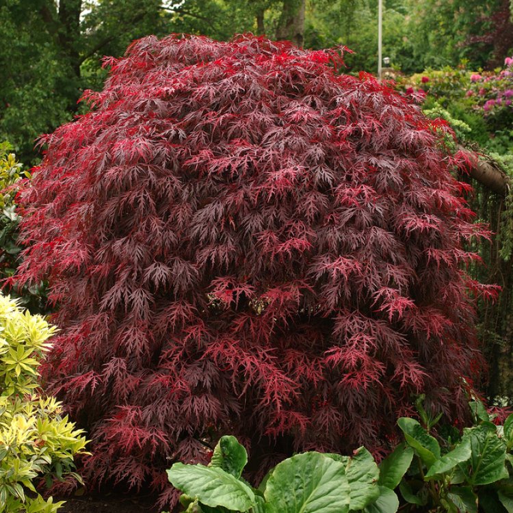 Acer palmatum ‘Garnet’ captivates with its deeply lobed, crimson foliage, creating a stunning focal point throughout the seasons in any UK garden.