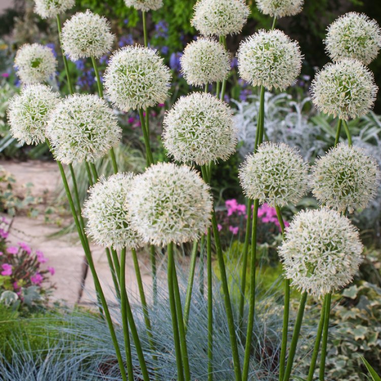 Discover Allium stipitatum ‘Mount Everest’, a magnificent ornamental onion that brings a touch of pure white elegance to UK gardens. Its towering, spherical blooms create a striking vertical accent, ensuring a memorable display.