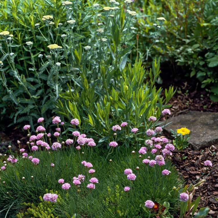 Armeria maritima ‘Schöne von Fellbach’ brings charm and resilience to your garden, showcasing delightful pink blooms above neat, evergreen foliage.