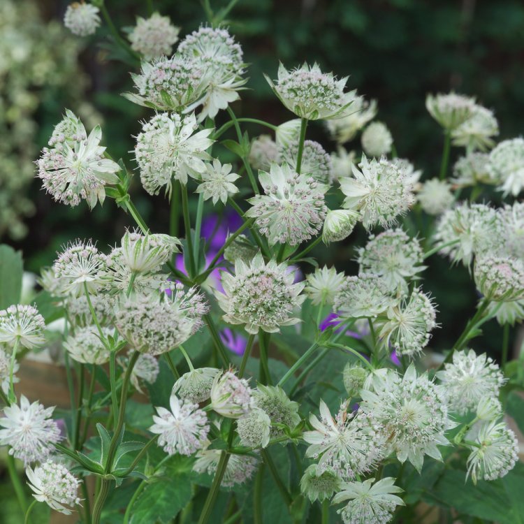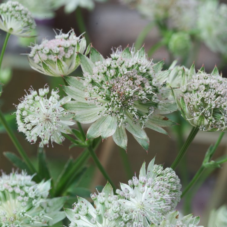 Astrantia ‘Buckland’ produces attractive, deeply lobed, palmate foliage in a rich green colour. These leaves form a neat basal clump, providing excellent ground cover. Their fresh appearance maintains interest throughout the growing season. From early summer, typically June, through to September or even October in the UK, the plant sends up sturdy stems. Each stem carries multiple flower heads. The blooms feature delicate shades of white, blush pink, and pale green, creating a subtly beautiful display. Their intricate structure adds fine texture to planting schemes.
