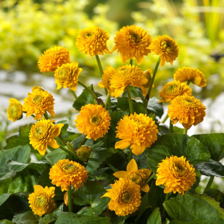 Caltha palustris ‘Plena’, the double Marsh Marigold, offers dazzling golden-yellow, pom-pom-like flowers in early spring. Ideal for pond margins or bog gardens, its vibrant blooms and glossy foliage create a stunning, wildlife-friendly display.