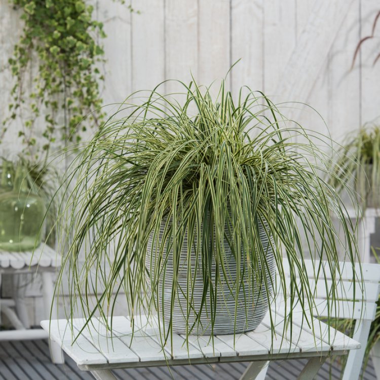 Add a touch of elegance to your garden with Carex ‘Feather Falls’, a stunning ornamental sedge featuring gracefully arching, variegated foliage.