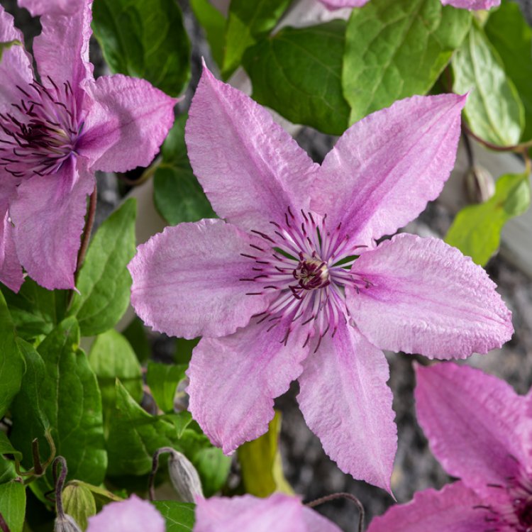 Clematis ‘Hagley Hybrid’ is a beautiful climber, displaying large, dusky pink flowers with reddish-purple anthers from June to September. Perfect for adding vertical colour and attracting pollinators to your UK garden.