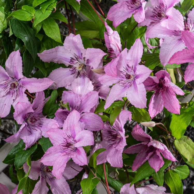 Clematis 'Hagley Hybrid' is a Group 2 clematis, requiring light pruning in late winter or early spring. Remove dead or weak stems and trim others to a strong pair of buds. Ensure it receives regular watering, especially during dry periods, and feed with a balanced fertiliser in spring. Provide sturdy support for its climbing stems as it grows.