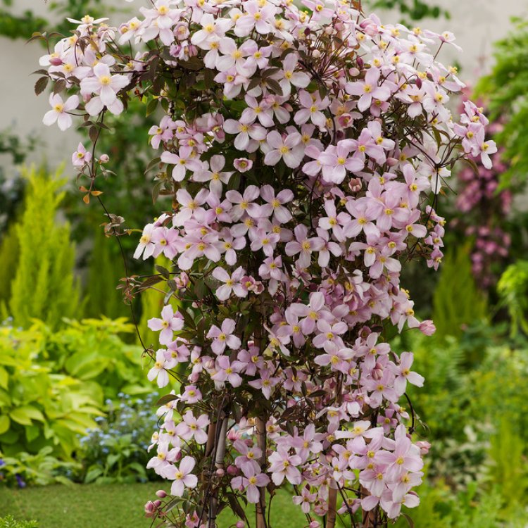 Clematis montana rubens is generally low-maintenance. Water regularly during dry periods, especially in the first year. Apply a balanced general-purpose fertiliser in spring. Pruning is minimal, primarily to manage size or remove dead/damaged growth after flowering. Provide sturdy support for its vigorous climbing habit. Ensure the base of the plant is shaded to keep the roots cool and moist, while allowing the top growth to reach for the sun.
