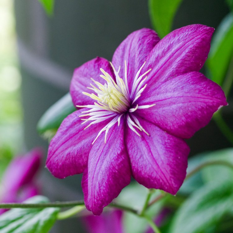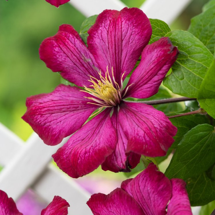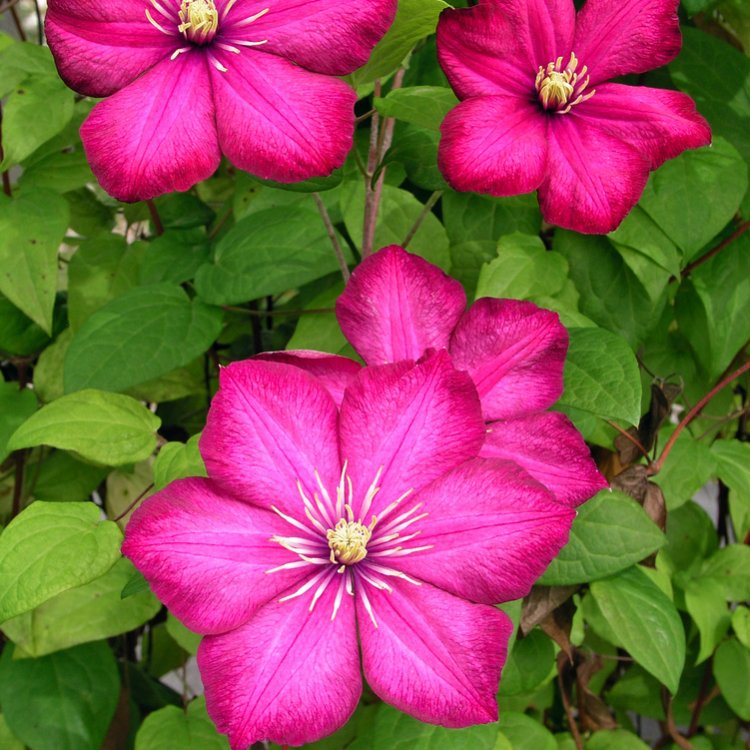 This particular clematis cultivar belongs to Pruning Group 3. Therefore, you should hard prune it in late winter or early spring. This encourages strong new growth and abundant flowering in the coming season. Furthermore, the plant thrives in a position where its “head” is in the sun but its “feet” are kept cool and shaded. This can be achieved by planting low-growing shrubs or perennials at its base.