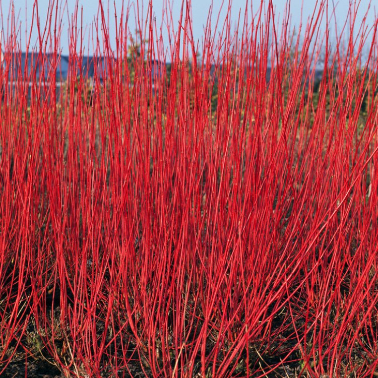 Cornus alba ‘Sibirica’ transforms winter gardens with its striking red stems, offering year-round visual interest and a vibrant display.