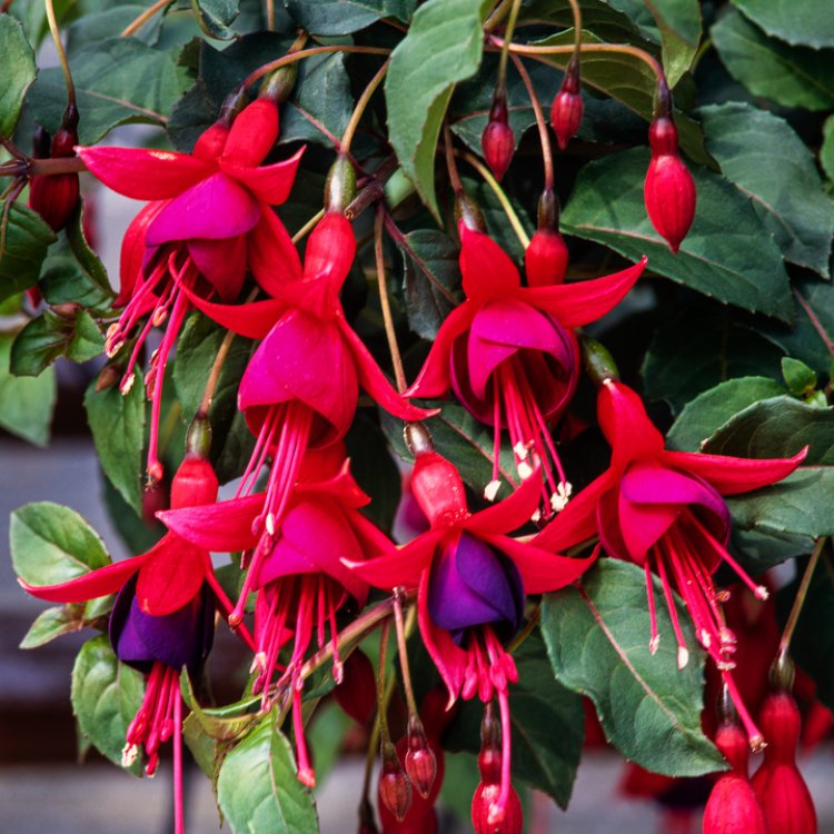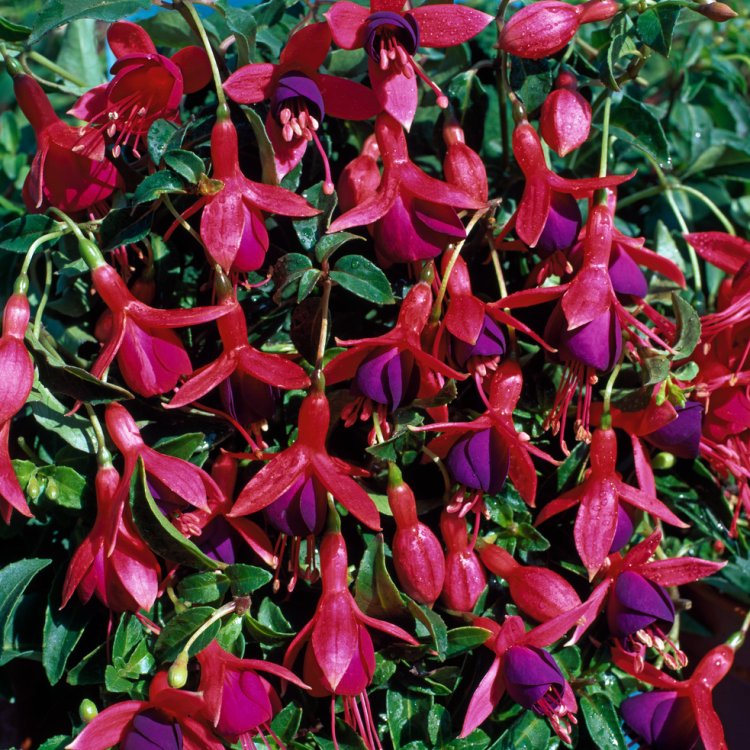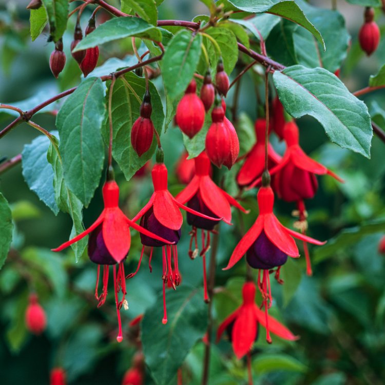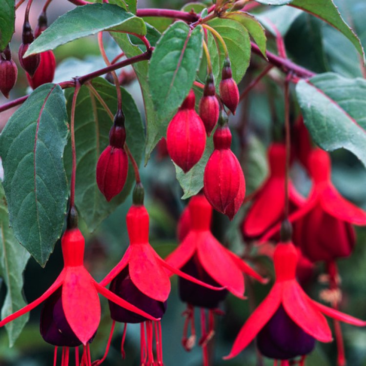 Fuchsia ‘Mrs Popple’ brings vibrant colour and charm to any UK garden, boasting distinctive crimson and purple flowers that cascade beautifully.