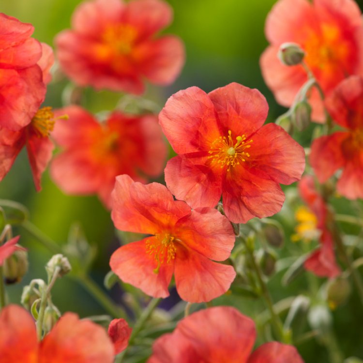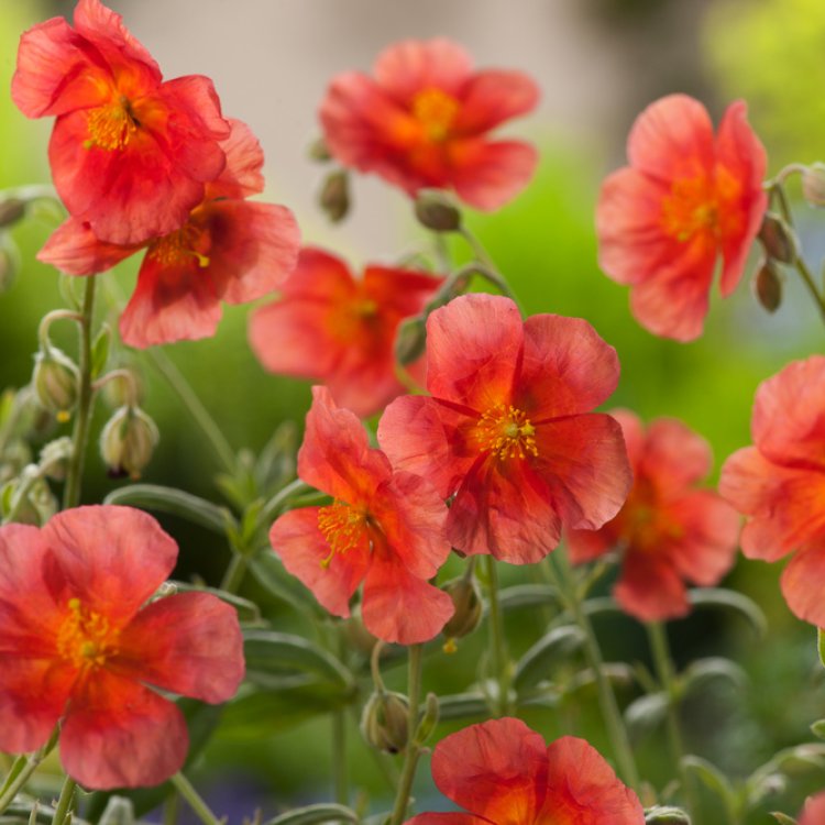 Helianthemum ‘Fire Dragon’ is a vibrant, low-growing rock rose, celebrated for its fiery orange-red blooms that bring warmth and brilliant colour to any garden.