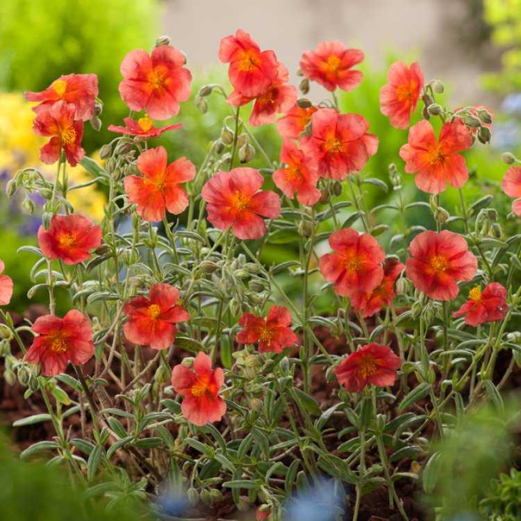 Plant Helianthemum 'Fire Dragon' in full sun and well-drained soil. Water regularly until established, then it is drought-tolerant. Prune lightly after the main flush of flowers to maintain shape and encourage further blooming. Remove any dead or damaged foliage to keep the plant tidy. Avoid heavy pruning into old wood. Apply a light general-purpose fertiliser in spring if needed, but avoid rich soils.