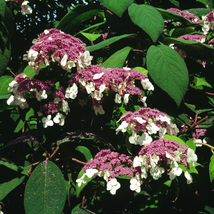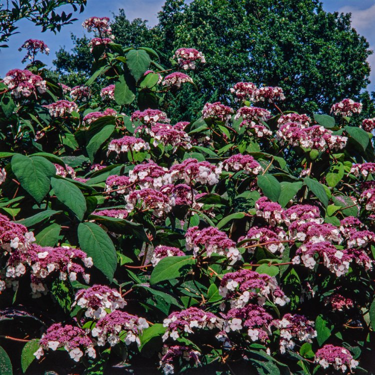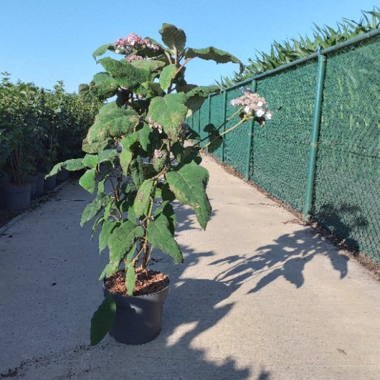 Hydrangea aspera 'Macrophylla' thrives in moist, well-drained soil. Ensure regular watering, especially during dry spells and in its first year after planting, to help it establish. Applying a thick layer of mulch around the base will help retain soil moisture and suppress weeds. Protect the plant from strong, cold winds which can damage new growth. Pruning is best done after flowering in late summer or early autumn, or in late winter/early spring before new growth begins. Focus on removing dead, damaged, or weak stems, and thin out any overcrowded growth to maintain an open structure and promote good air circulation. Fertilise annually in spring with a balanced slow-release fertiliser.