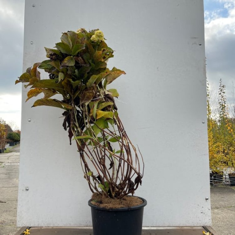 Hydrangea macrophylla 'Nikko Blue' requires moist, well-drained soil; water regularly, especially during dry spells. For the iconic blue blooms, maintain acidic soil by using a specific hydrangea blueing agent or adding sulphur/peat. Prune after flowering by removing spent flower heads down to a strong pair of buds, and cut back any old or weak stems. Established plants benefit from a balanced feed in spring. Protect from late frosts in spring if new growth has started.