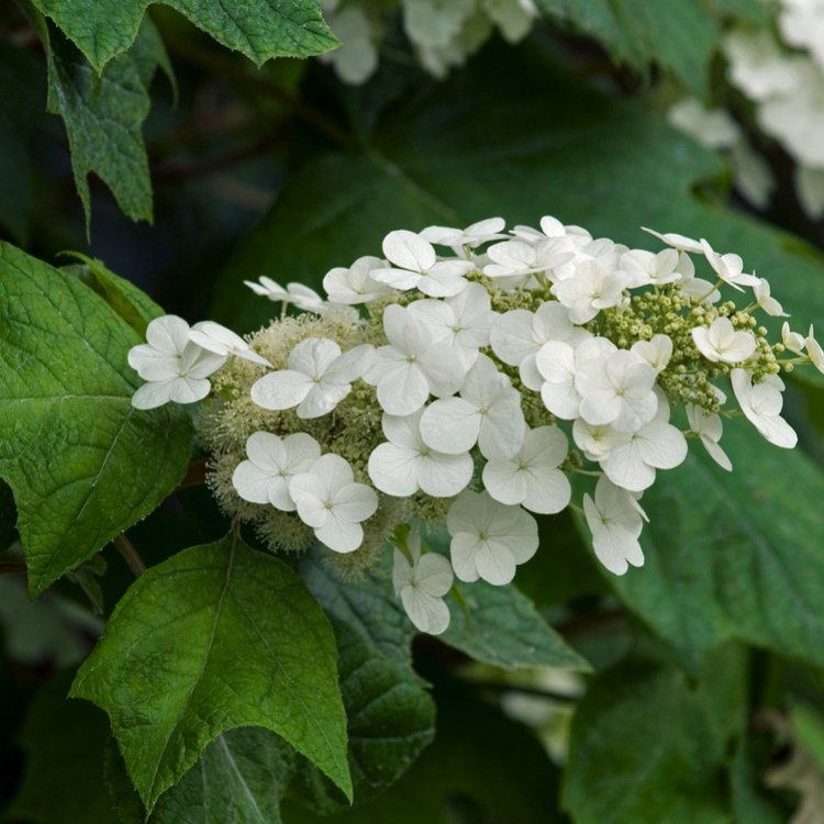 Water thoroughly and regularly during dry periods, especially during its first year of establishment. Ensure the soil remains consistently moist but not waterlogged. Apply a balanced, slow-release granular fertiliser around the base in early spring as new growth begins. Lay a 5-7cm layer of organic mulch, such as composted bark or leaf mould, around the plant's base in spring. This helps retain soil moisture, regulate temperature, and suppress weeds. Prune Hydrangea quercifolia lightly in late winter or early spring before new growth appears. Focus on removing any dead, damaged, or crossing branches. Minimal pruning is usually sufficient to maintain its natural shape; avoid heavy pruning as flowers form on old wood. In very exposed or exceptionally cold areas, a protective layer of mulch can further safeguard roots during severe winters, though it is generally very hardy.