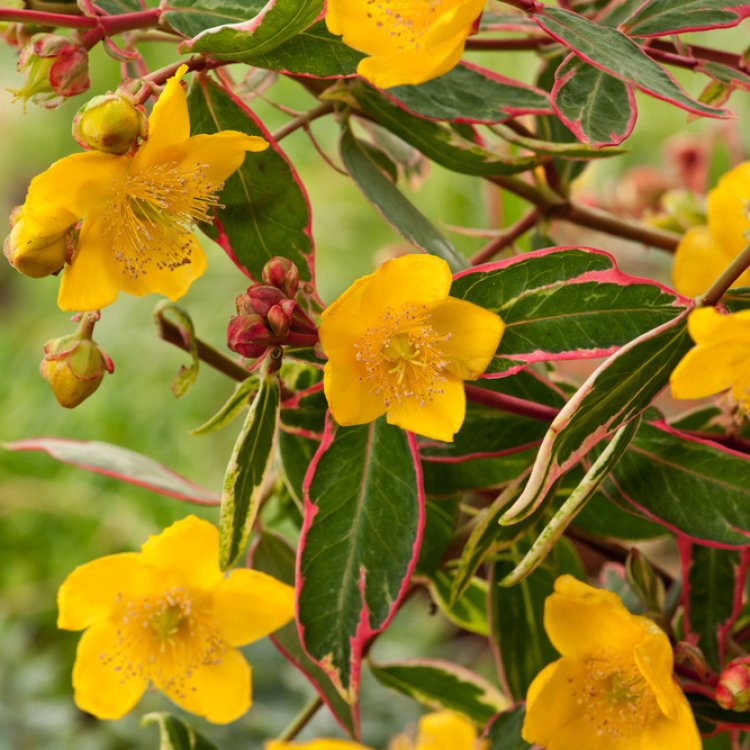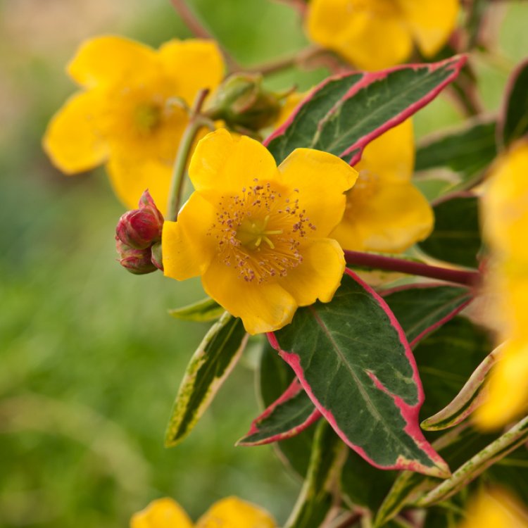 Hypericum moserianum ‘Tricolor’ offers truly unique variegated foliage, creating a vibrant focal point in UK gardens, beautifully complemented by bright, cheerful yellow flowers.