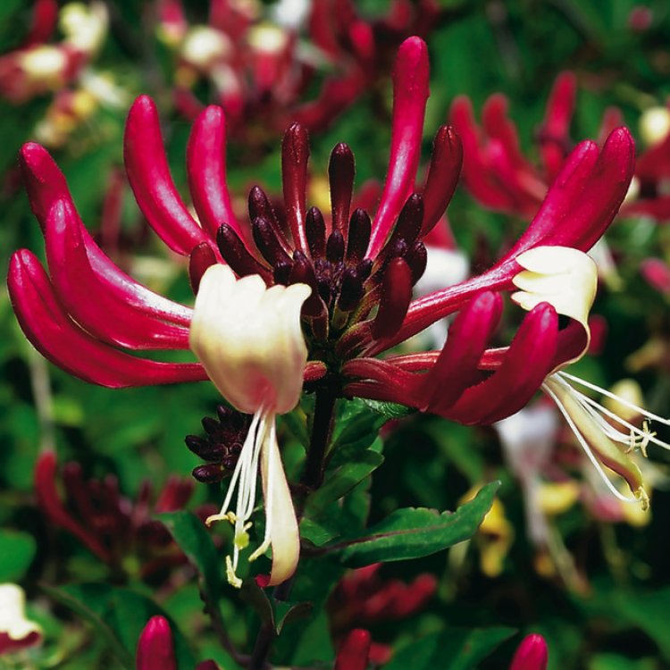 The foliage of this honeysuckle presents as simple, oval-shaped green leaves. These provide a fresh backdrop to the stunning blooms. From July, and often continuing into October, the plant is adorned with flowers. Initially, these appear as deep reddish-purple buds. They then open to reveal trumpet-shaped flowers. The outside is a rich purplish-red. Meanwhile, the inside petals are a creamy-yellow. These striking colour contrasts create a truly beautiful sight. Moreover, the flowers release a powerful, sweet perfume. This fragrance is especially strong in the evening. As the flowers fade, bright red berries appear. These berries add another layer of visual interest.
