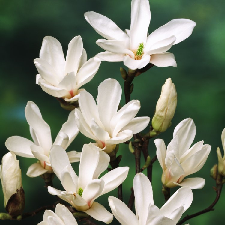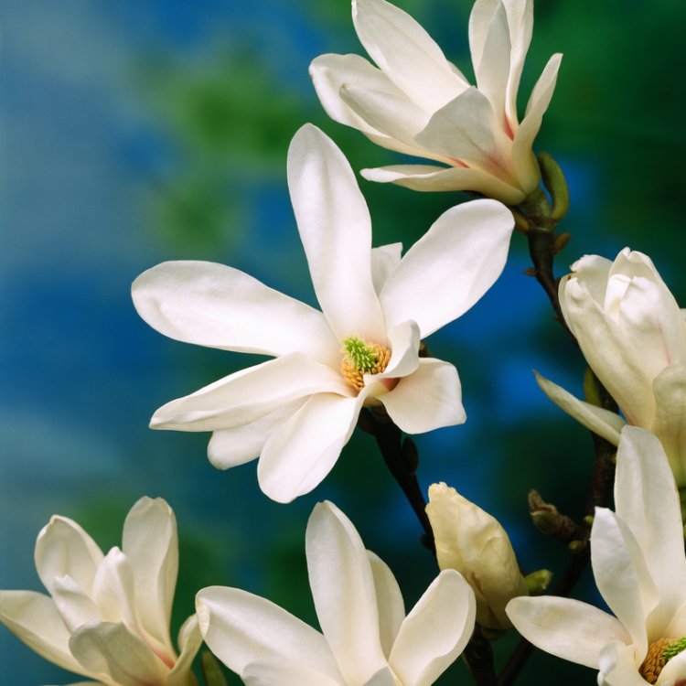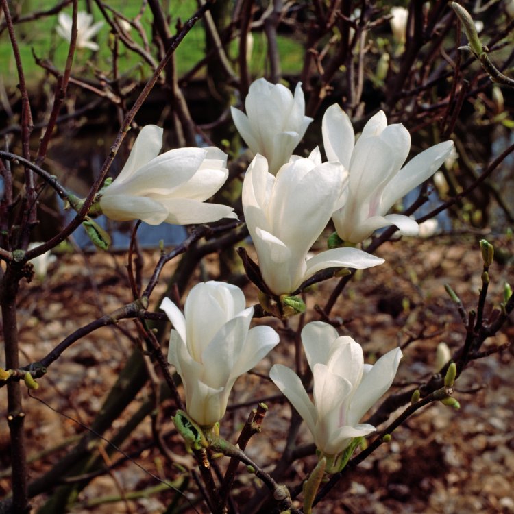 Magnolia soulangeana 'Alba Superba' prefers a sheltered spot, away from strong winds and late spring frosts which can damage early blooms. Plant in well-drained, humus-rich, slightly acidic to neutral soil. Mulch annually with well-rotted compost or leaf mould to retain moisture and suppress weeds, avoiding direct contact with the stem. Water regularly during dry spells, especially in the first few years after planting. Prune minimally; only remove dead, damaged, or crossing branches immediately after flowering. Avoid heavy pruning. Generally, Magnolias are not prone to many pests or diseases, but watch for magnolia scale or honey fungus in poorly drained conditions.