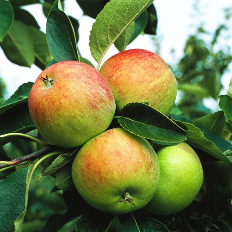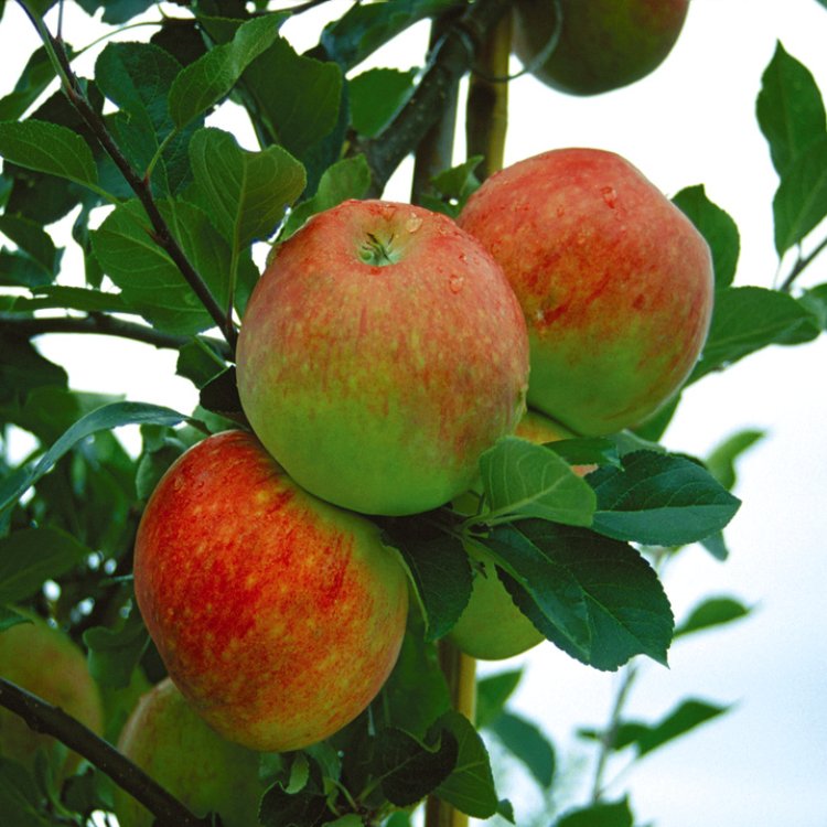 Water newly planted trees regularly until established. Provide consistent moisture during dry spells, especially when fruits are developing. Apply a balanced granular fertiliser around the base in late winter or early spring, following product instructions. Undertake winter pruning annually to remove dead, damaged, or diseased wood, and to maintain an open structure for good air circulation and light penetration. Summer pruning can control growth and encourage fruiting spurs. Regularly inspect the tree for signs of common apple pests (e.g., aphids, codling moth) and diseases (e.g., apple scab, canker). Address issues promptly using appropriate organic or chemical treatments if necessary. Provide staking for young trees to ensure strong, upright growth, removing once established. Keep the area around the base of the tree clear of weeds to reduce competition for water and nutrients.