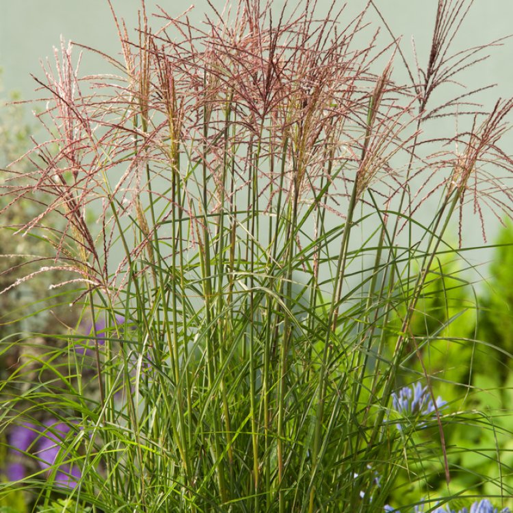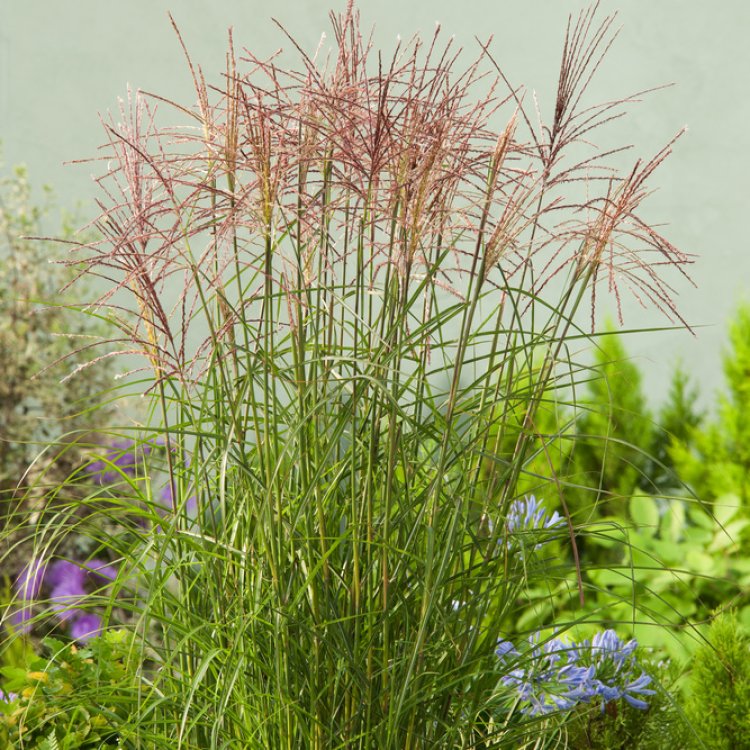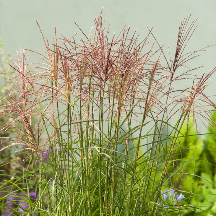 Miscanthus sinensis ‘Roter Pfeil’ transforms gardens with its striking ornamental appeal, offering vibrant autumn colours and elegant plumes.
