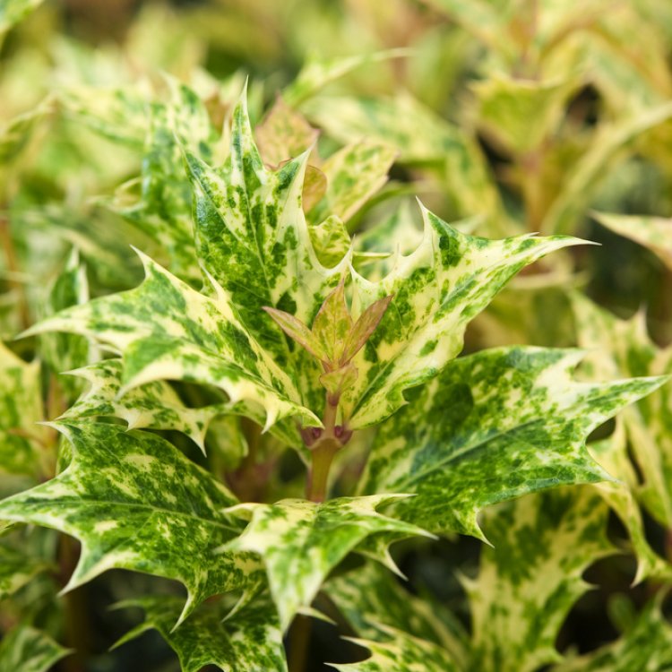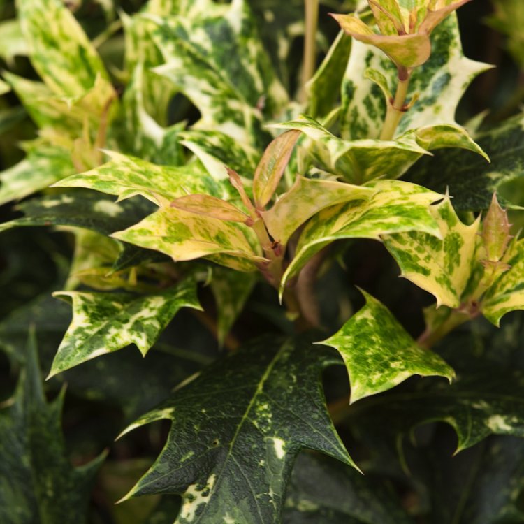 Osmanthus heterophyllus ‘Goshiki’ is a true garden gem. Its name, ‘Goshiki’, actually means “five colours” in Japanese. This perfectly describes its incredible foliage display. New growth starts with lovely pink and coppery shades. These then transition to green leaves richly speckled with cream, yellow, and grey-green. Each leaf resembles a holly leaf, featuring prickly edges.