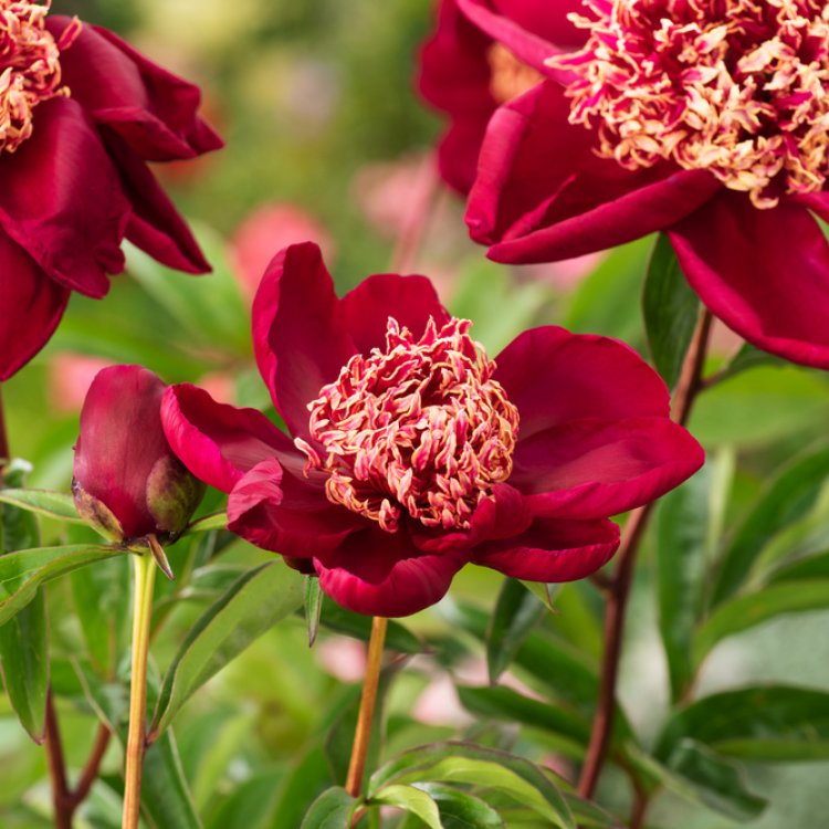 Paeonia ‘Nippon Beauty’ boasts a fascinating flower structure that sets it apart. Its vibrant ruby-red guard petals form a cup, elegantly encircling a densely packed centre of slender, golden-tipped staminodes. These distinctive flowers truly command attention in any garden setting.