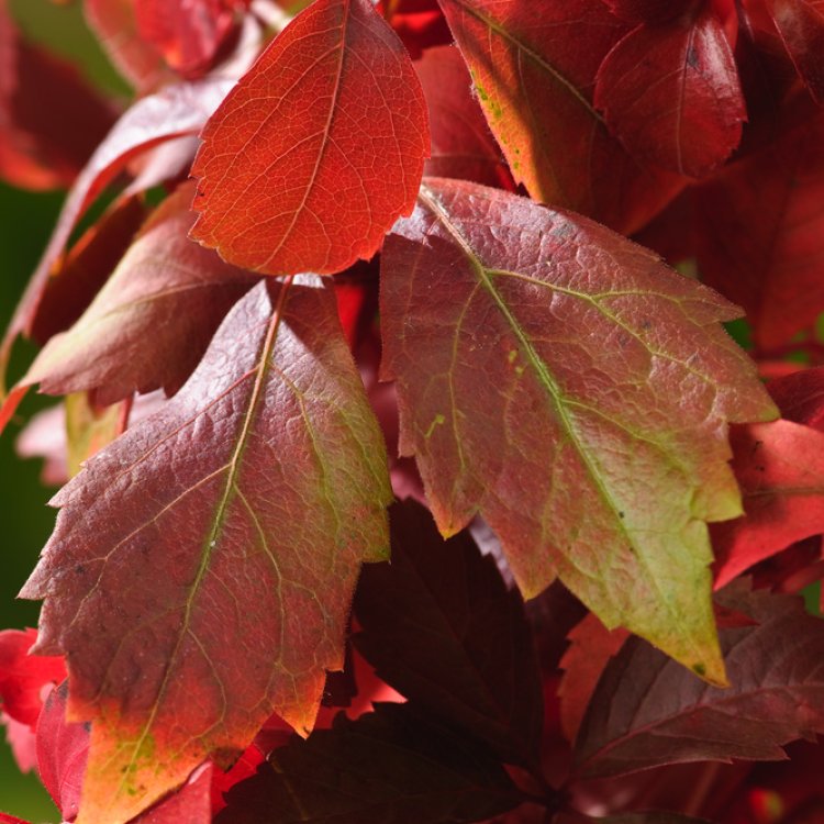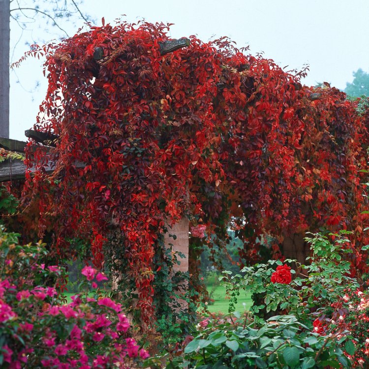Parthenocissus quinquefolia, also known as Virginia Creeper, is a vigorous, deciduous climber renowned for its spectacular crimson and purple autumn foliage, bringing dramatic seasonal colour.