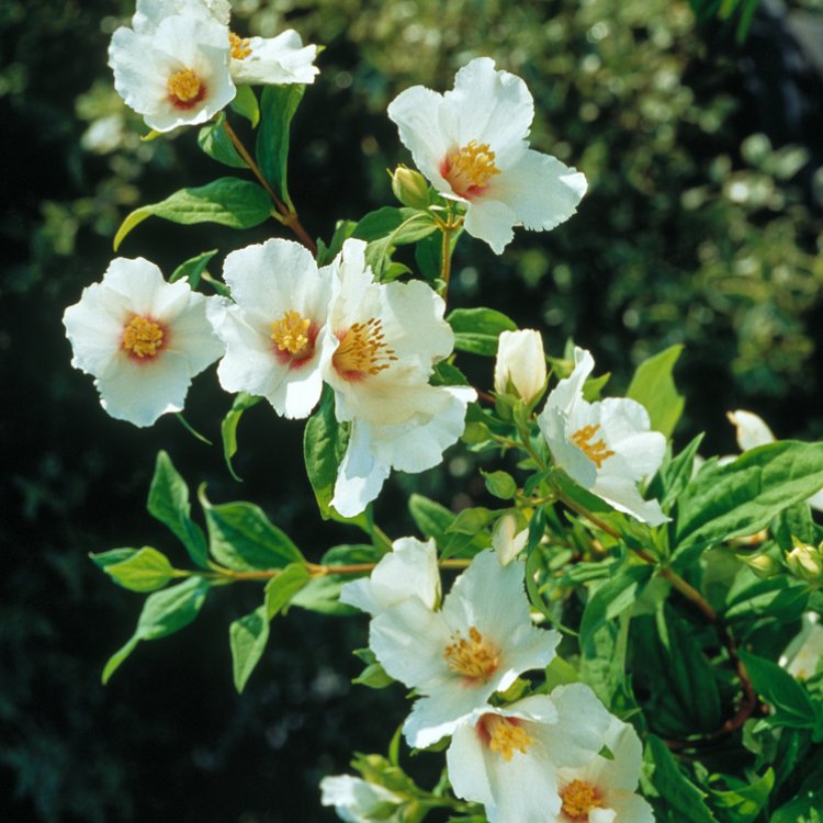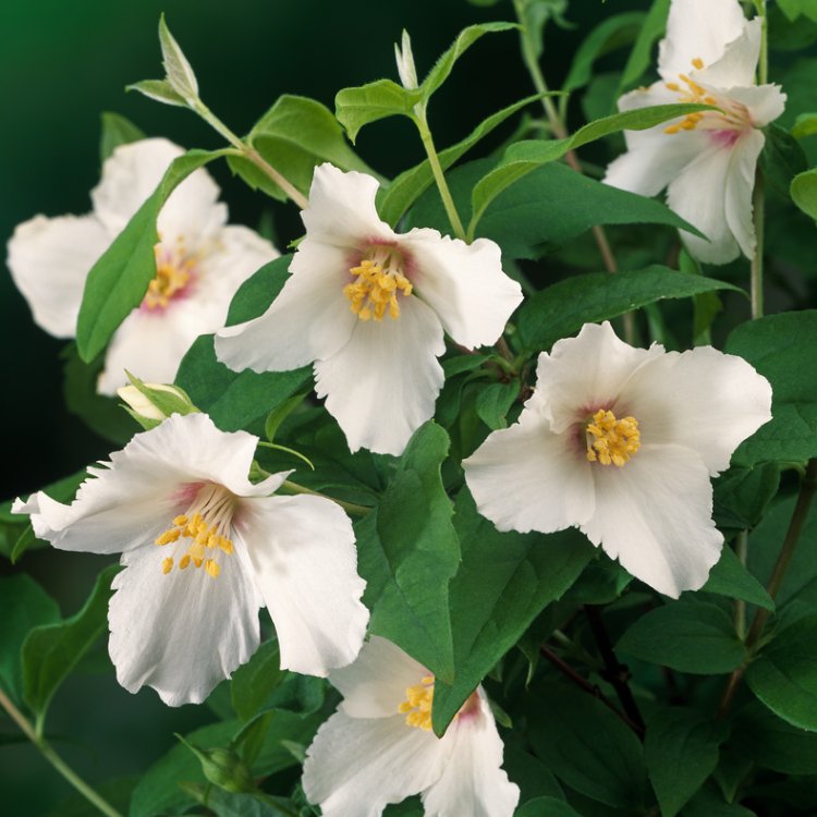 Philadelphus ‘Belle Etoile’, or Mock Orange, offers abundant, fragrant white flowers with unique reddish-purple centres. This versatile, deciduous shrub provides a delightful scent in early summer and attracts vital pollinators to UK gardens.