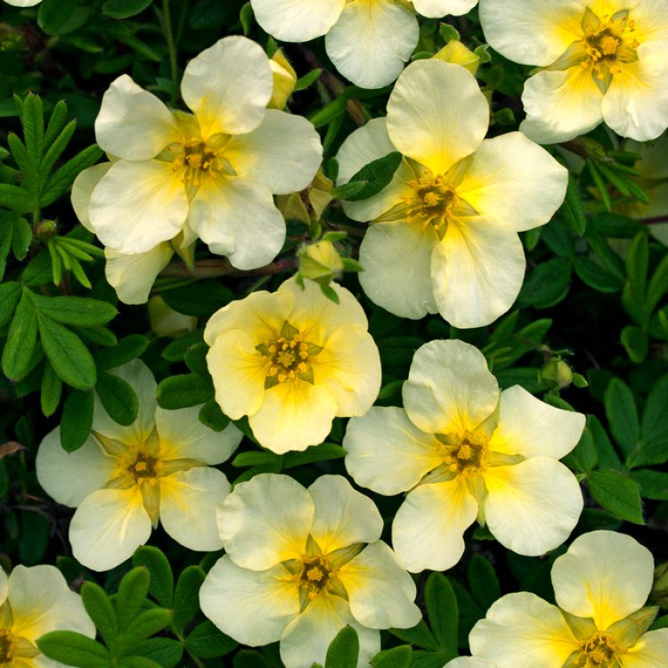 Potentilla fruticosa ‘Limelight’ offers a vibrant spectacle for UK gardens, known for its distinctive foliage and cheerful, long-lasting blooms.