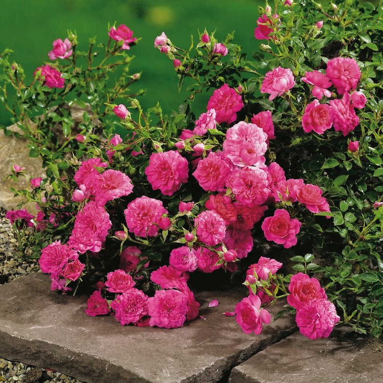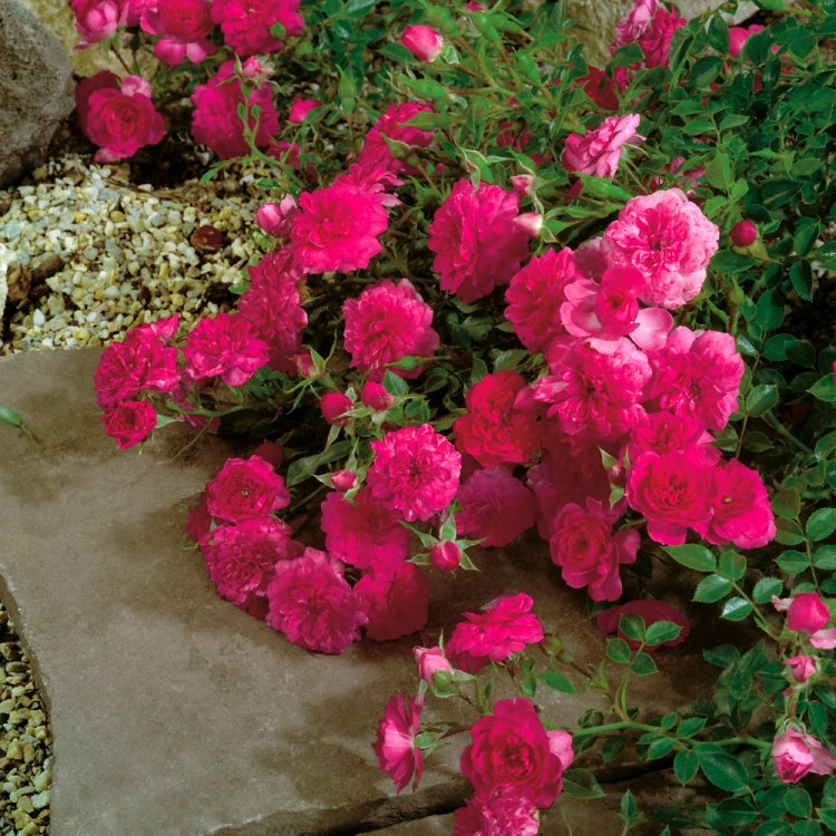 Rosa (H) Knirps is a charming dwarf groundcover rose, perfect for British gardens. It produces abundant clusters of small, double pink flowers from early summer to autumn. Ideal for borders, containers, or groundcover, it also attracts bees and butterflies.