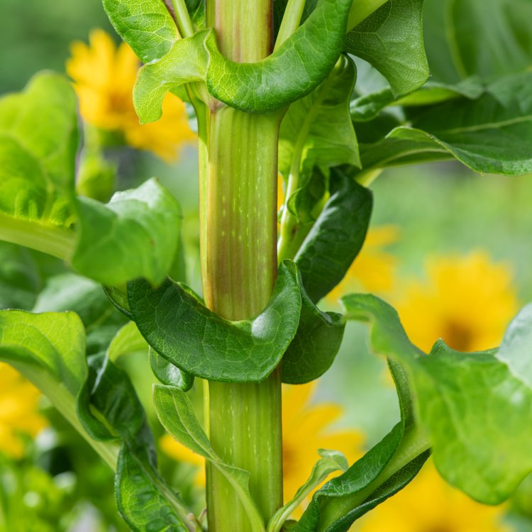 The stems of Silphium perf. JS Maya are notably square, adding to its structural appeal. They stand tall, reaching impressive heights. Above all, the plant showcases bright yellow, sunflower-like blooms. These appear from July, continuing their display right through to September. As such, they provide continuous colour during the late summer and early autumn. The vibrant flowers contrast beautifully with its deep green foliage. This creates a visually stunning effect in your garden.