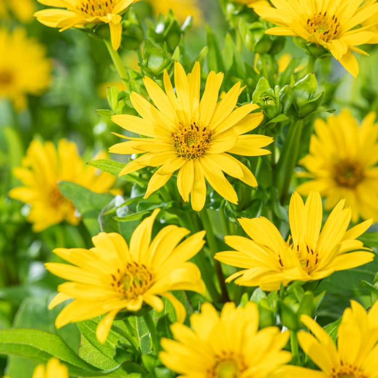 Silphium perf. JS Maya thrives in moist, well-drained soil and requires consistent watering, especially during dry spells. A light application of general-purpose fertiliser in spring can promote vigorous growth. This plant is generally low-maintenance. Cut back old stems in late autumn or early spring to encourage fresh growth and maintain tidiness. If desired, you can perform a 'Chelsea chop' (cutting back stems by about a third in late May or early June) to reduce the plant's overall height and encourage a bushier habit. Tall specimens may benefit from staking in exposed positions to prevent wind damage.
