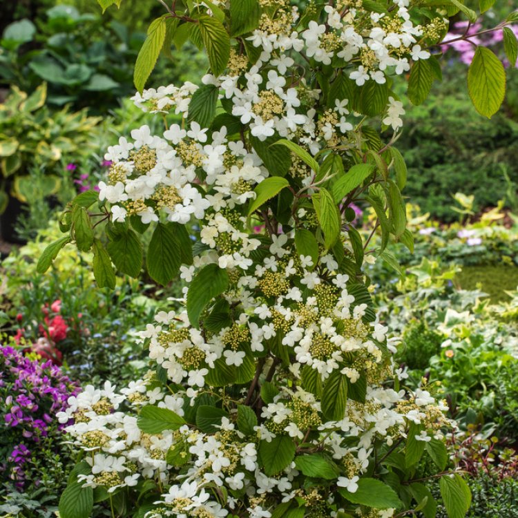 Thanks to its distinctive, upright form and moderate size, Viburnum plicatum Kilimandjaro makes an outstanding specimen plant, drawing the eye wherever it is placed. It is also well-suited for mixed borders, woodland gardens, or even in larger containers on a patio. The plant’s structure provides year-round interest, while its abundant flowers serve as a valuable nectar source, attracting essential pollinators such as bees and butterflies. Minimal pruning is typically required, mainly to maintain its elegant shape or remove any dead wood after the main flowering period.