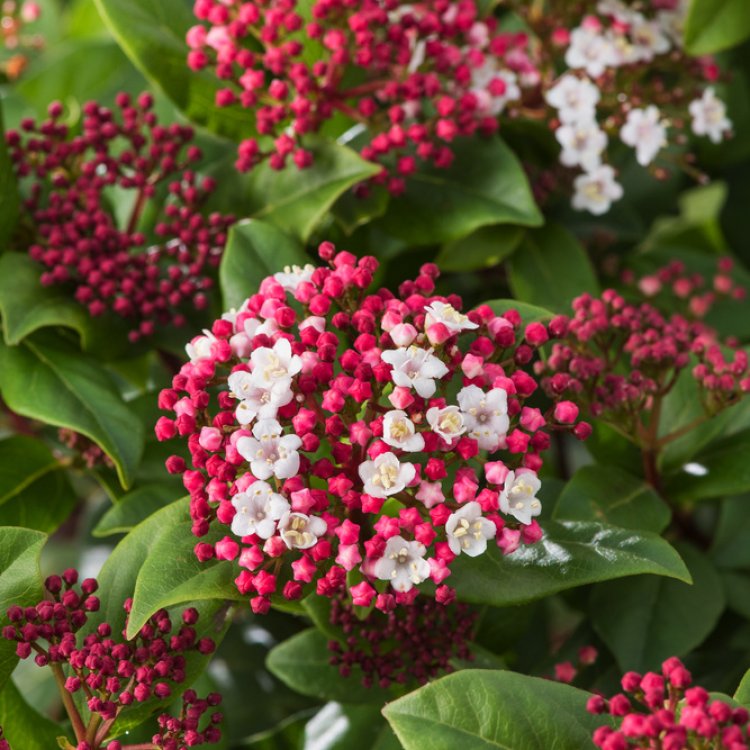 Discover Viburnum tinus ‘Gwenllian’, a superb evergreen shrub that brings enduring beauty and winter interest to any British garden, flourishing vibrantly.
