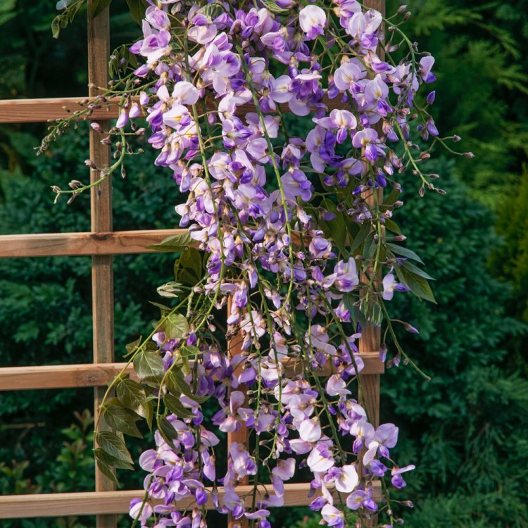 This vigorous woody climber unveils its extraordinary beauty in late spring and early summer. It produces a cascade of long, pea-like flowers, generally measuring up to 60cm in length. These exquisite racemes hang gracefully, showcasing a captivating violet-blue hue. Not only are the flowers visually striking, but they also emit a sweet, pervasive fragrance which perfumes the air, inviting you to linger nearby.